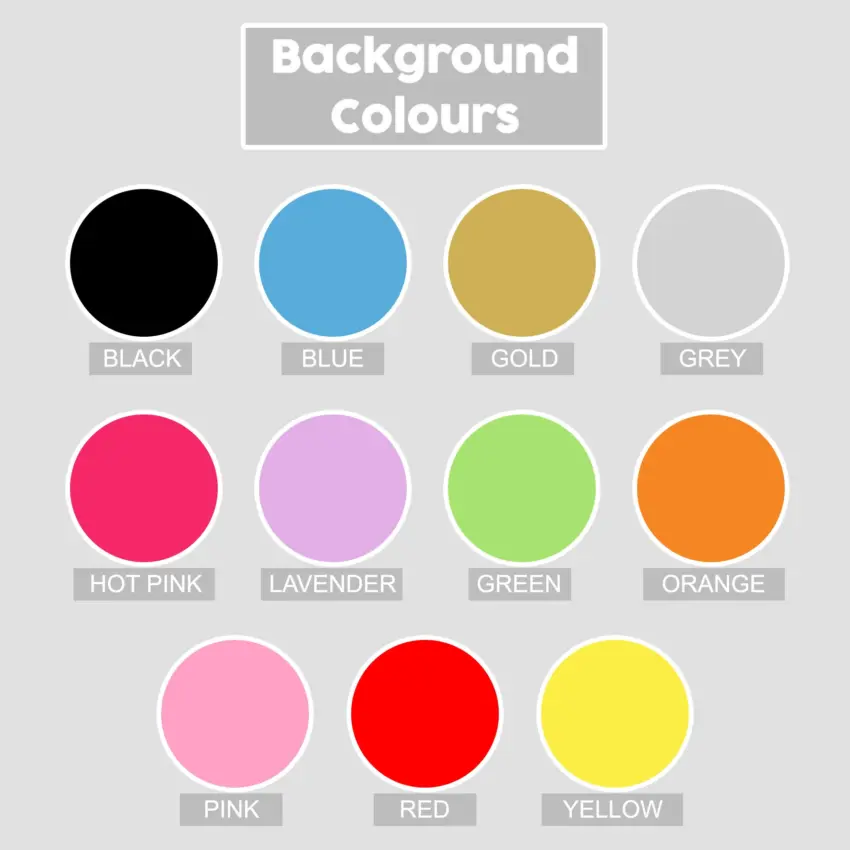 | Background Colour | Black, Blue, Metallic Gold, Grey, Hot Pink, Lavender, Green, Orange, Pink, Red, Yellow |