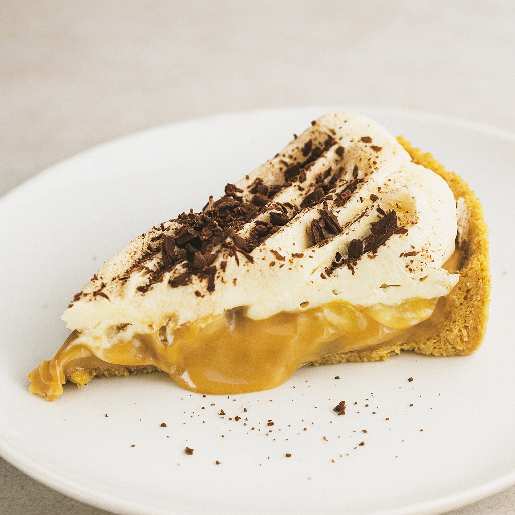 Shortcrust pastry,caramel filling, bananas and whipped cream topping.