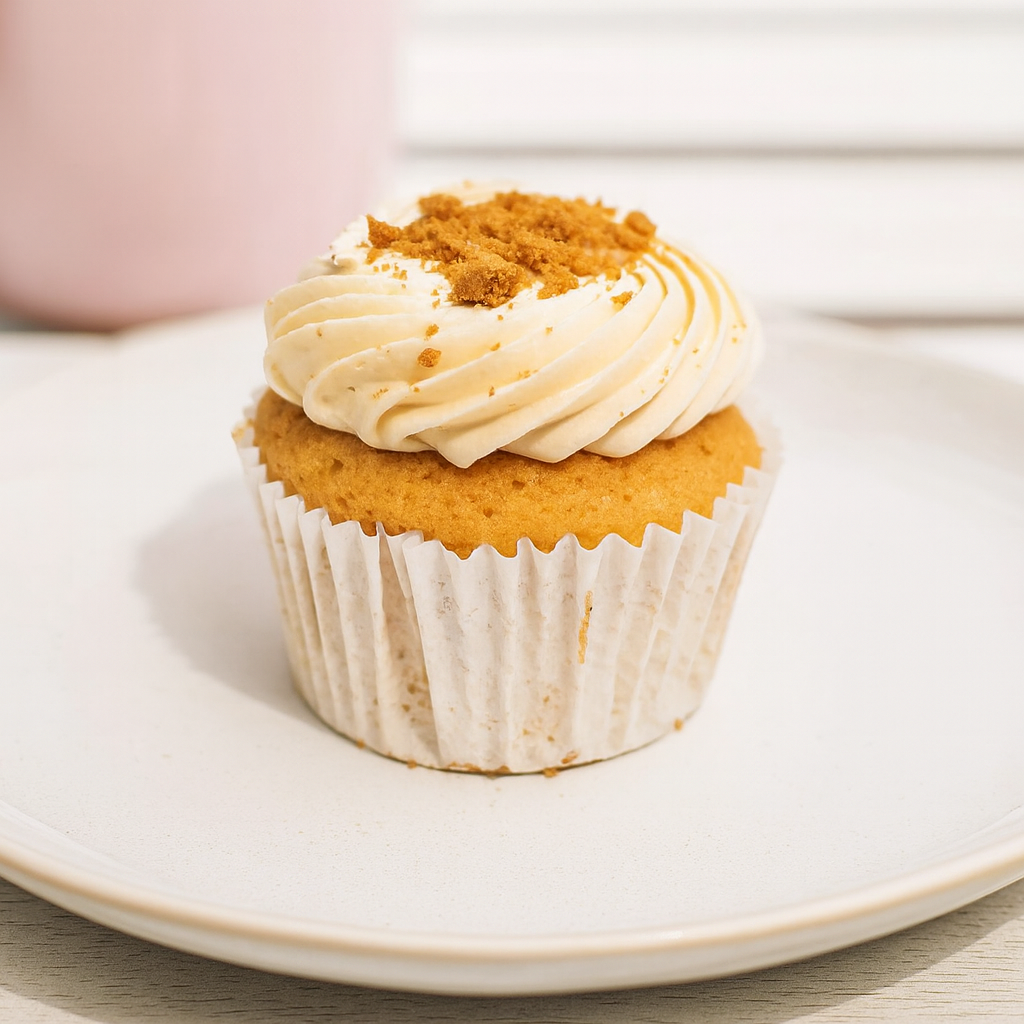 Delicious cupcake filled with biscoff spread and topped with biscoff crumbs and spread.