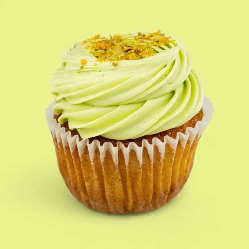 Pistachio cupcake: pistachio sponge cupcake, white chocolate and pistachio filling, pistachio buttercream!