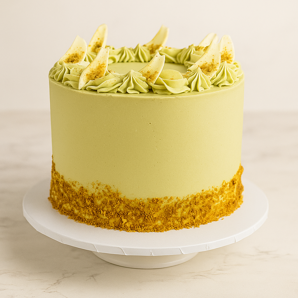 Vanilla sponge filled with white choc and pistachio buttercream and pistachio cream!